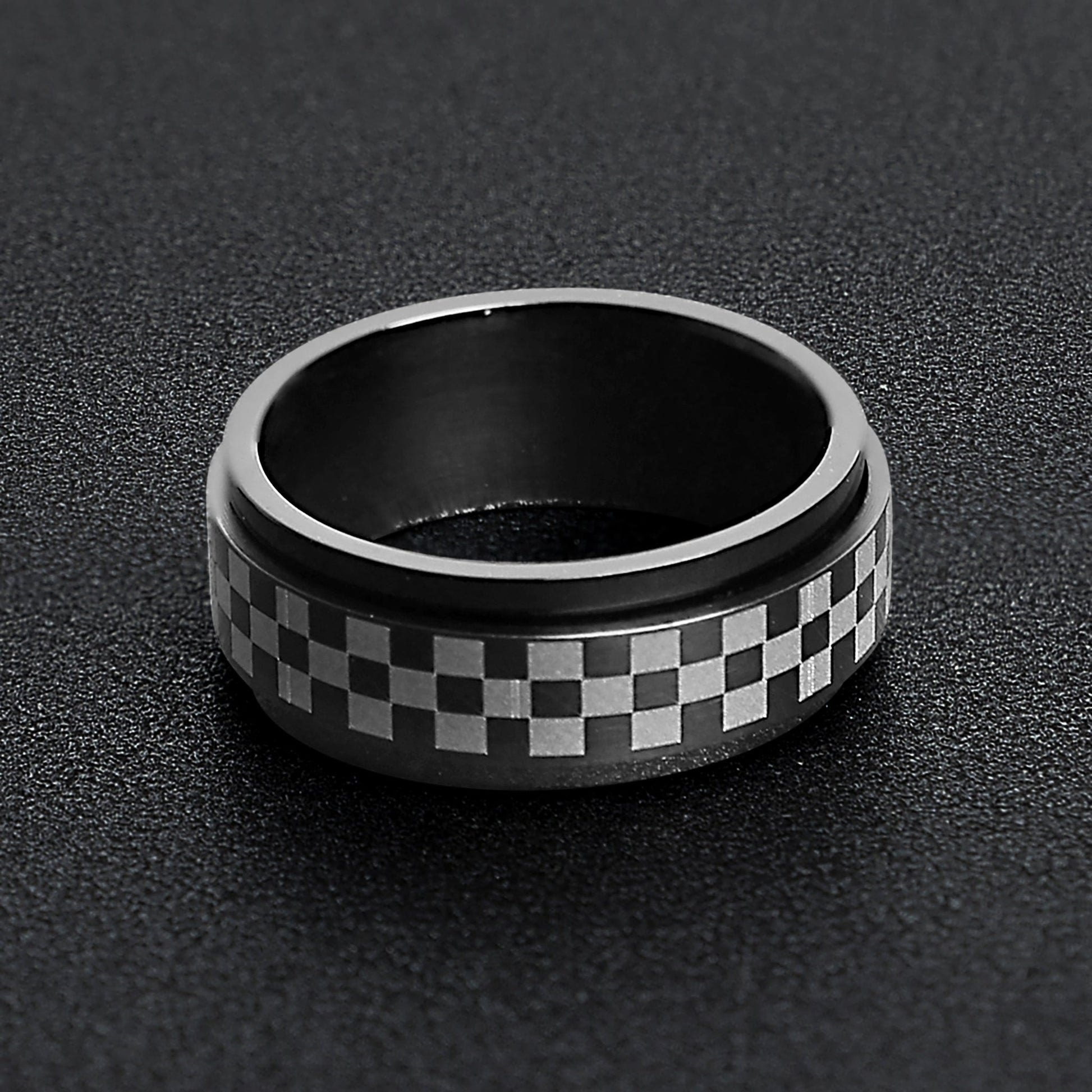 The Black Checkered Spinner Ring is more than just a ring. Crafted with a polished black stainless steel inner layer and silver and black checkered top layer that spins 360°, this ring provides entertainment while it also helps to relieve stress. The Stainless Steel Black Checkered Spinner Ring is made with surgical stainless steel that offers enhanced durability, even after everyday wear.