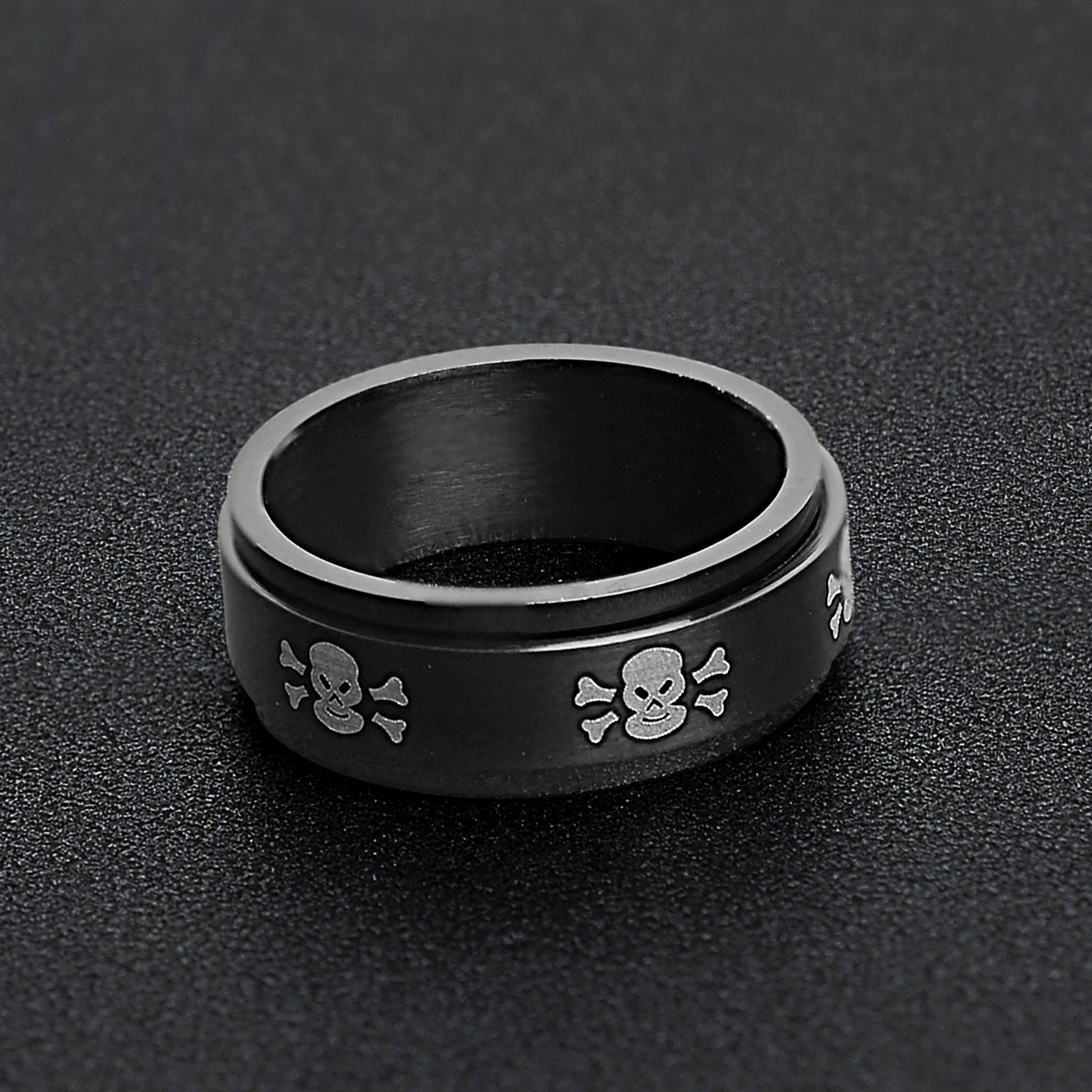 The Black & White Skull Spinner Ring is more than just a ring. Crafted with a polished black stainless steel inner layer and top layer that spins 360°, this ring provides entertainment while it also helps to relieve stress. This alternative ring features a black band with white skull and crossbones designs around the band. The Stainless Steel Black & White Skull Spinner Ring is made with surgical stainless steel that offers enhanced durability, even after everyday wear.