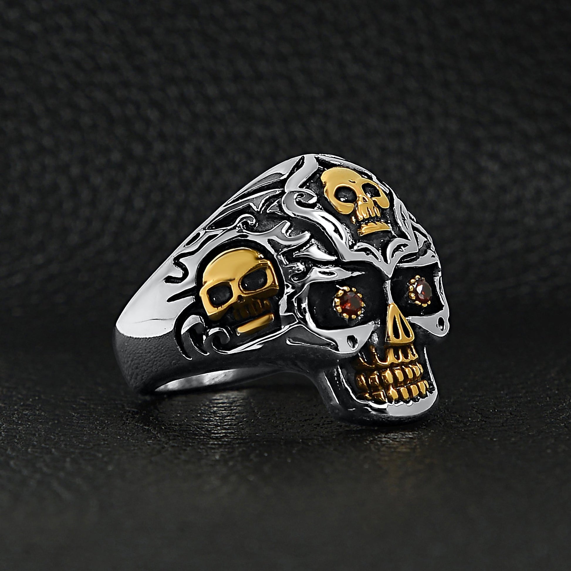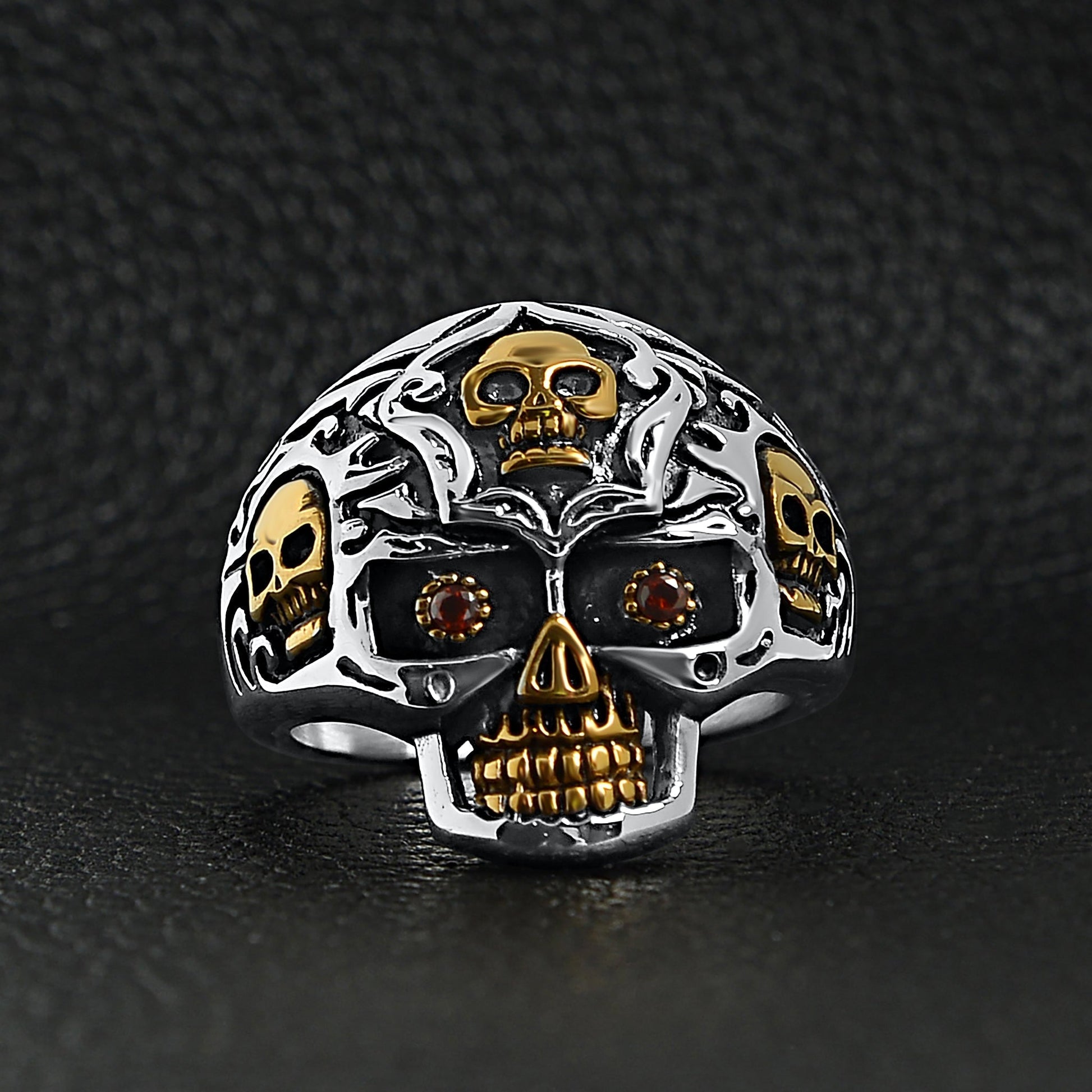 Description: Stainless steel 18K gold plated red Cubic Zirconia eyed filigree skull ring.