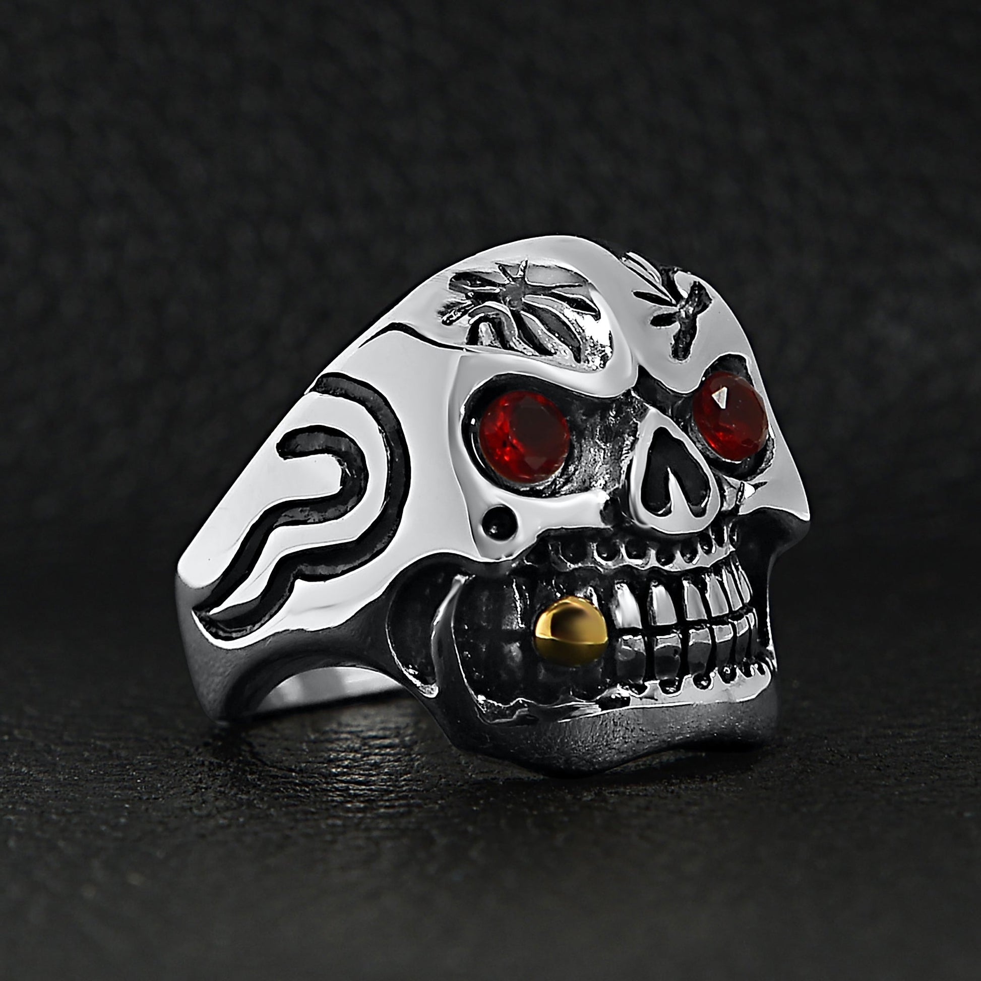 Stainless Steel Bullet Cigar Smoking Red CZ Eyed Skull Ring