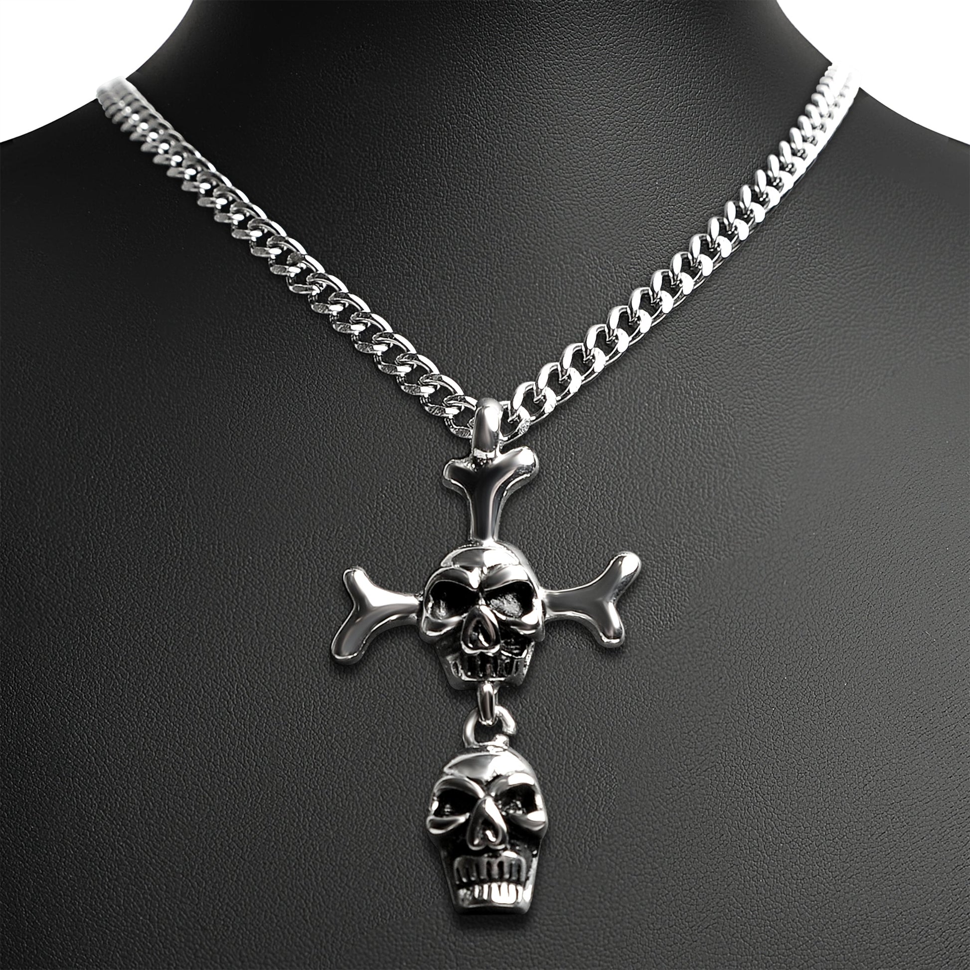 Description: Stainless Steel Double Skull And Bones Figaro Chain Necklace