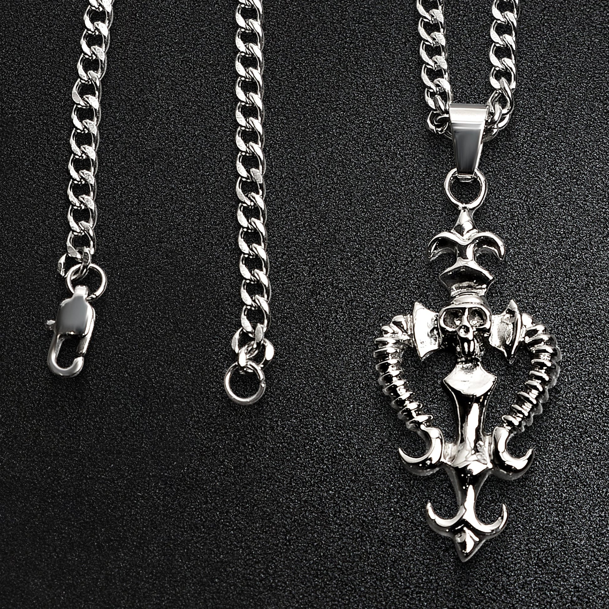 Stainless Steel Fleur De Lis Skull And Bone Dagger Curb Chain Necklace
