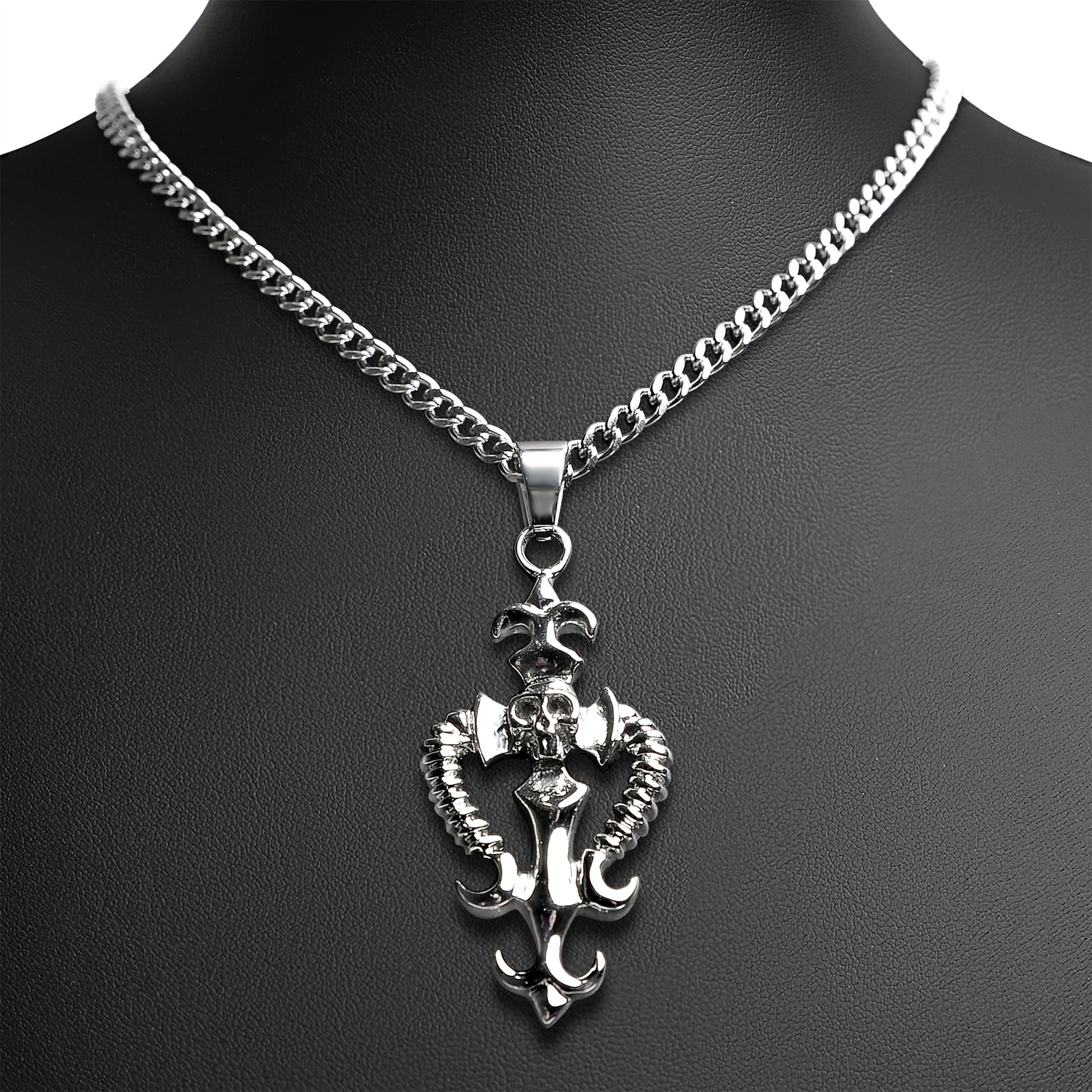 Description: Stainless Steel Fleur De Lis Skull And Bone Dagger Curb Chain Necklace