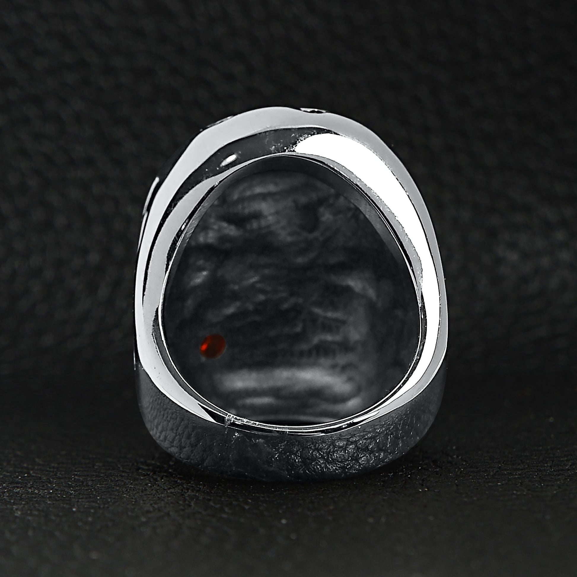 Description: Stainless steel large filigree skull biting red Cubic Zirconia rose ring.