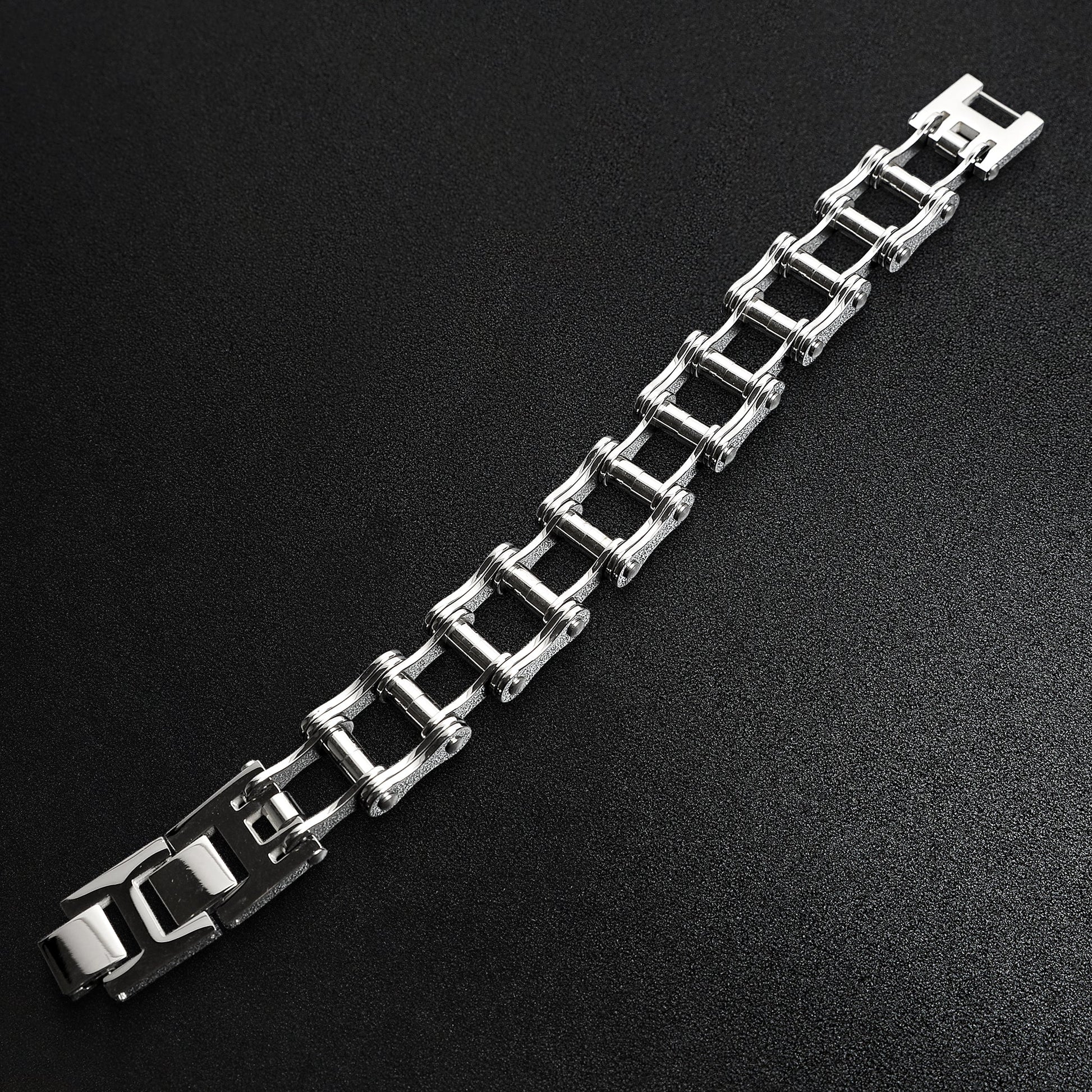 The Stainless Steel Bike Chain Bracelet from our Biker Collection is made of premium stainless steel that offers enhanced durability, even after exhaustive every day wear on the road. The unique motorcycle bike chain bracelet design combined with a polished finish makes the silver bike chain bracelet the perfect accent for every day outfits and more. This Bike Chain Bracelet features a medium size chain width that looks great on both Men and Women. Wear your new Stainless Steel Bike Chain Bracelet without worry in the water or while you sweat, all jewelry from Biker Jewelry Shop is made to last!