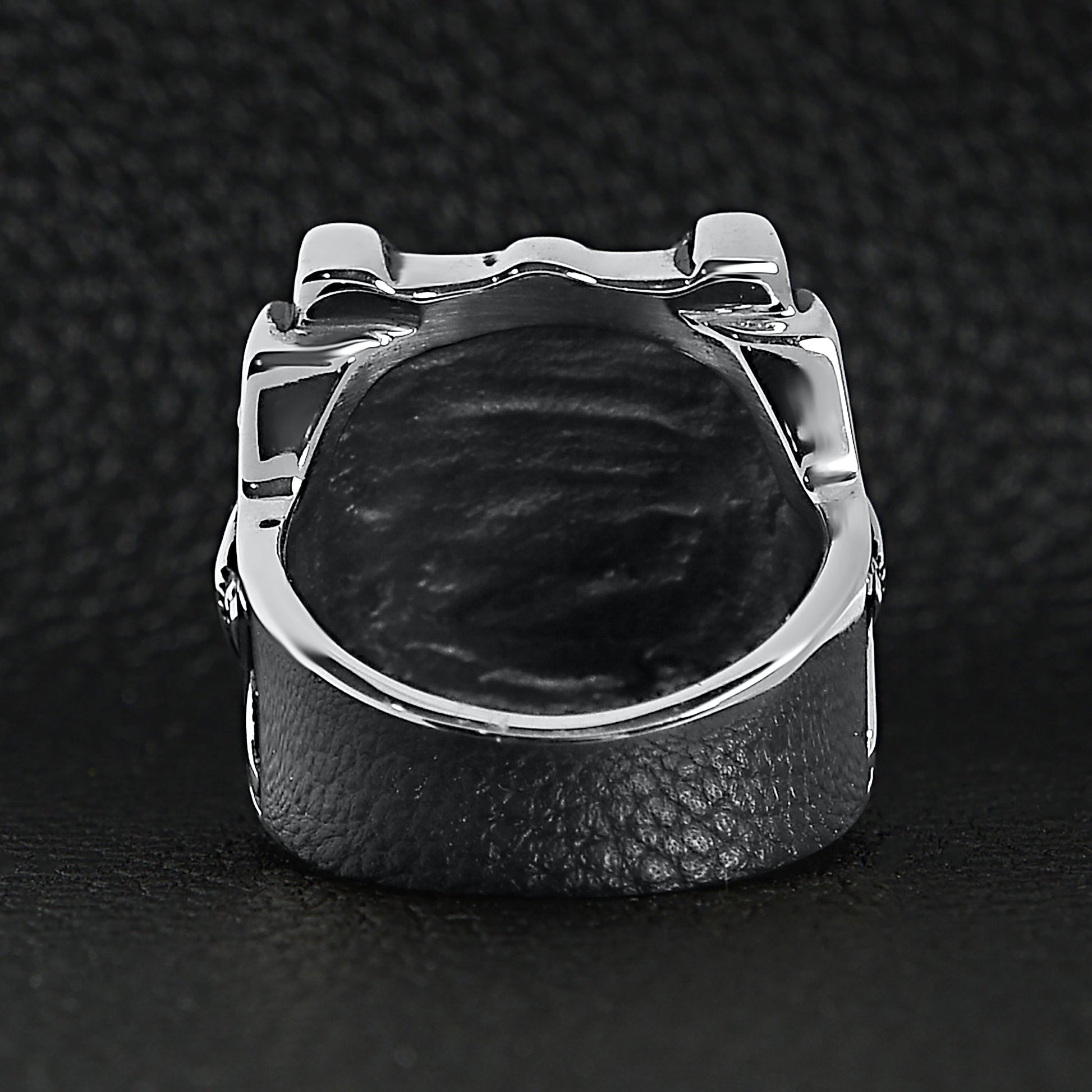 Description: Stainless steel polished studded skull signet ring.