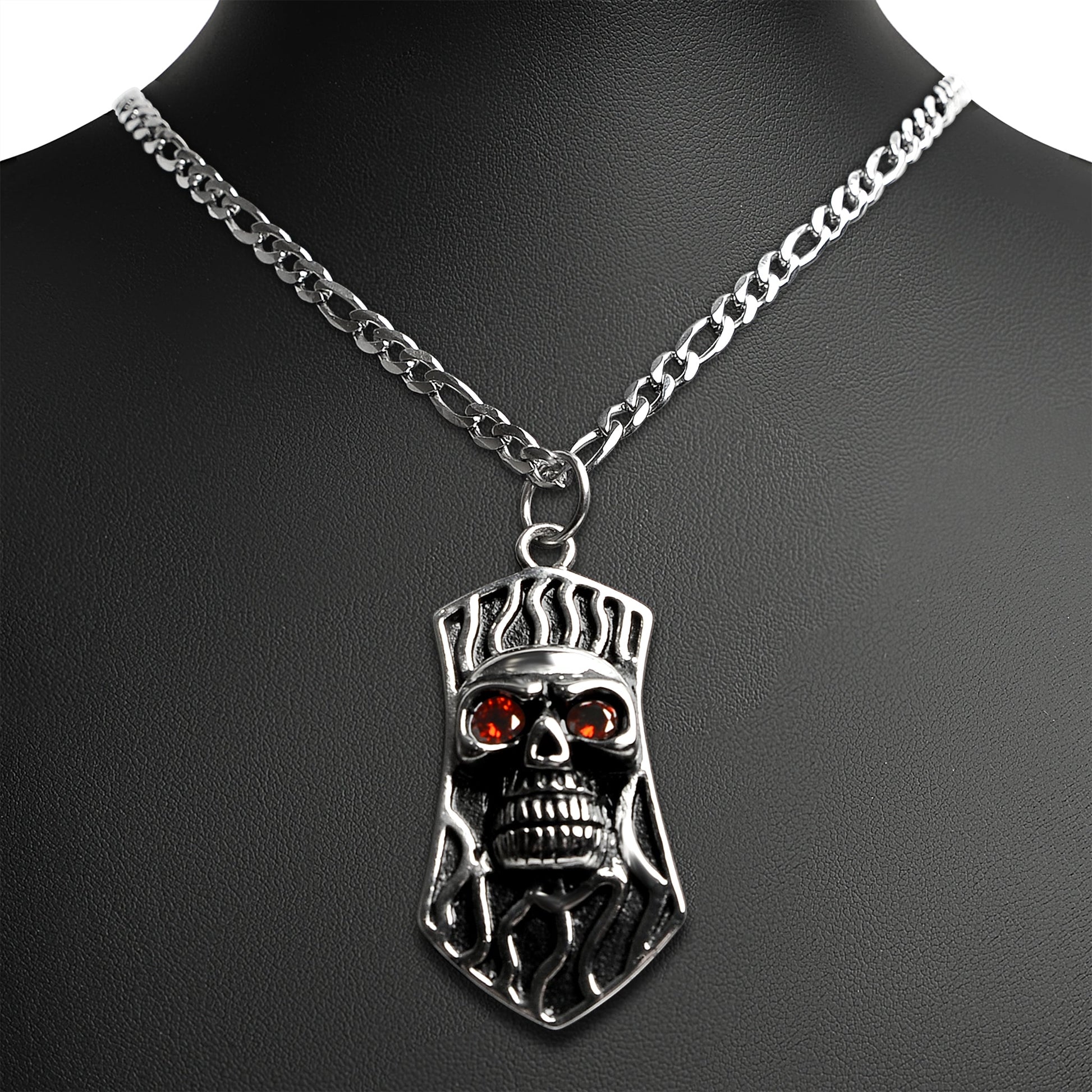 Description: Stainless Steel Red CZ Eyed Skull Shield Figaro Chain Necklace