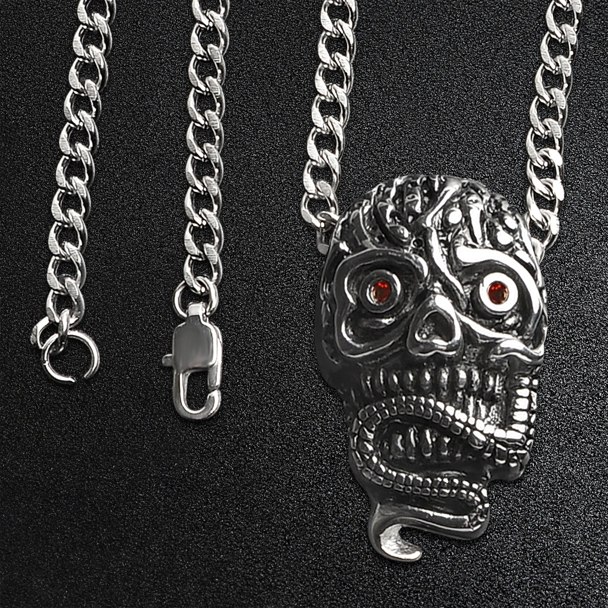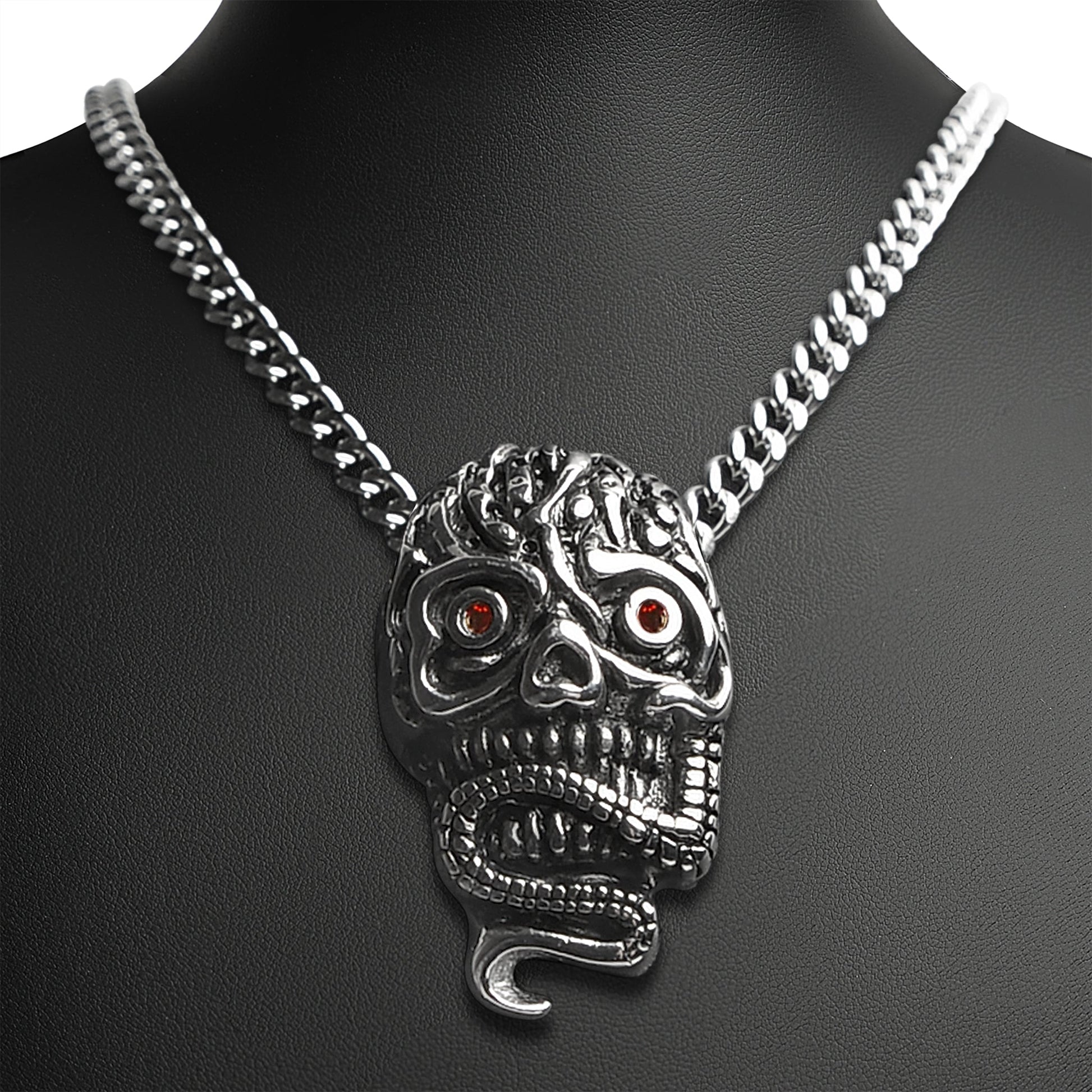 Description: Stainless Steel Red CZ Eyed Skull With Snake Curb Chain Necklace