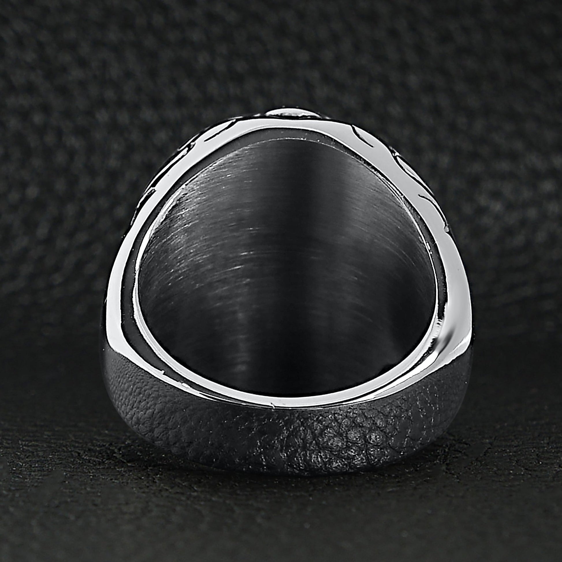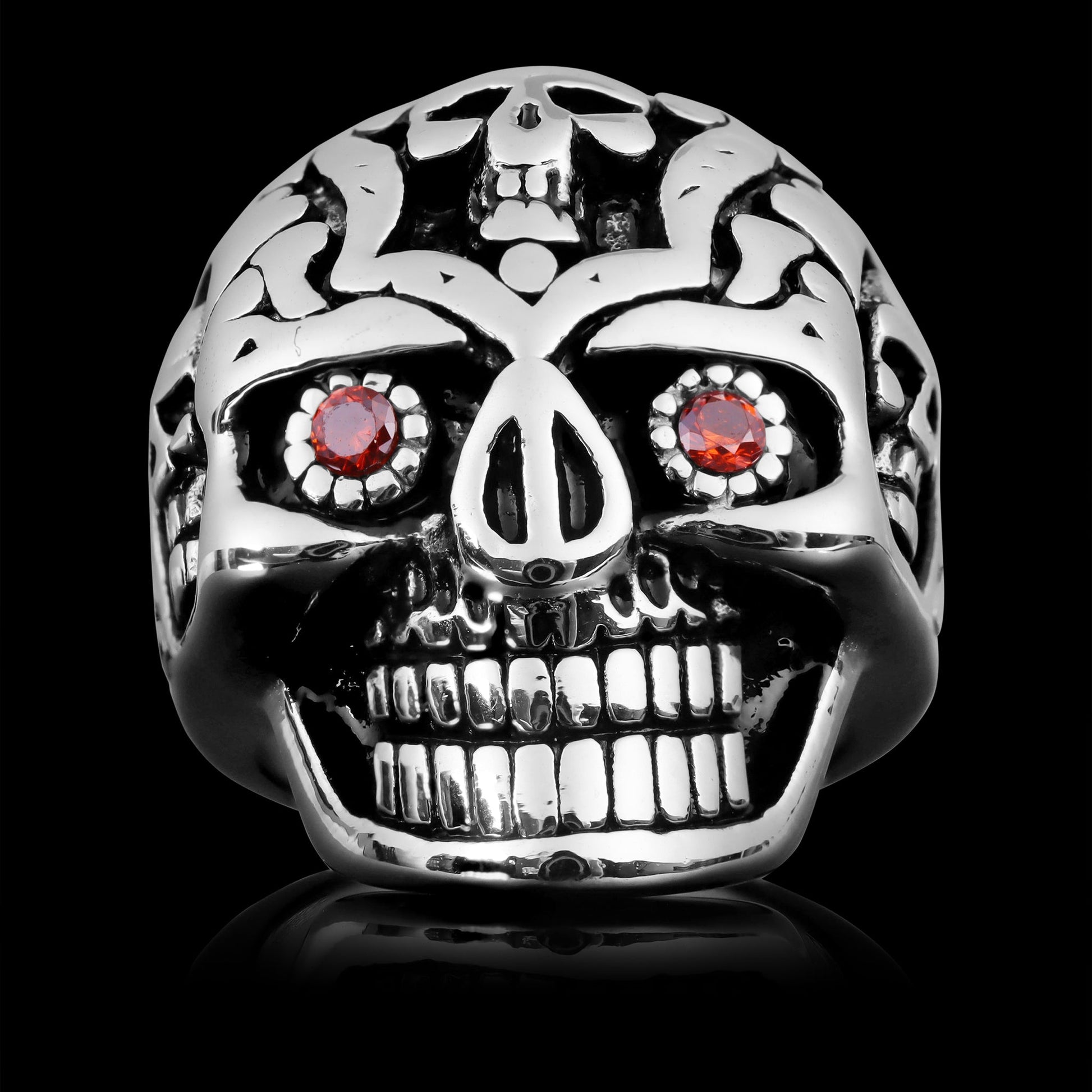 Description: Stainless steel red Cubic Zirconia eyed sugar skull ring.