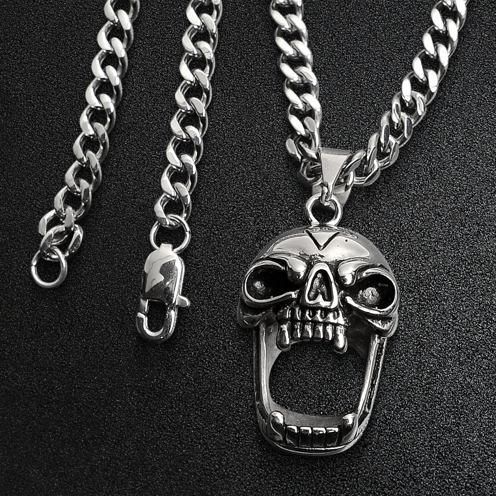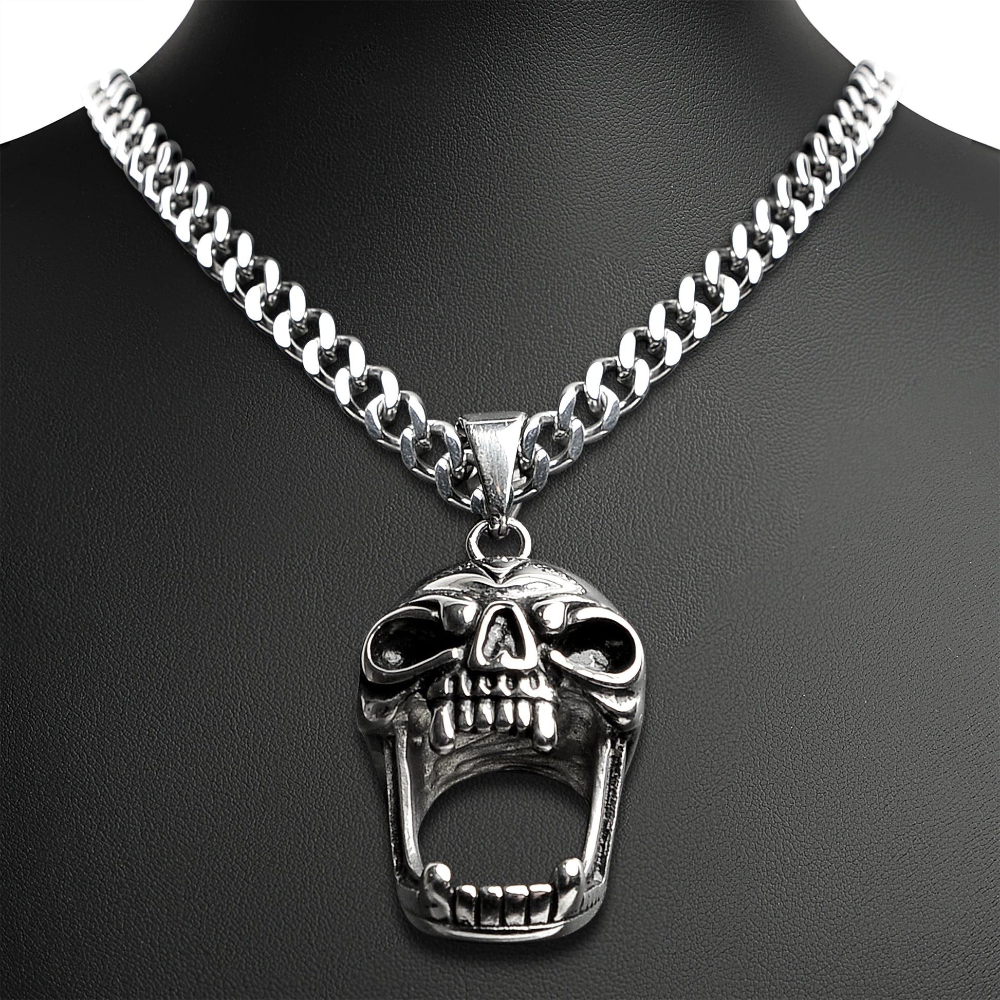 Description: Stainless Steel Screaming Fanged Skull Curb Chain Necklace